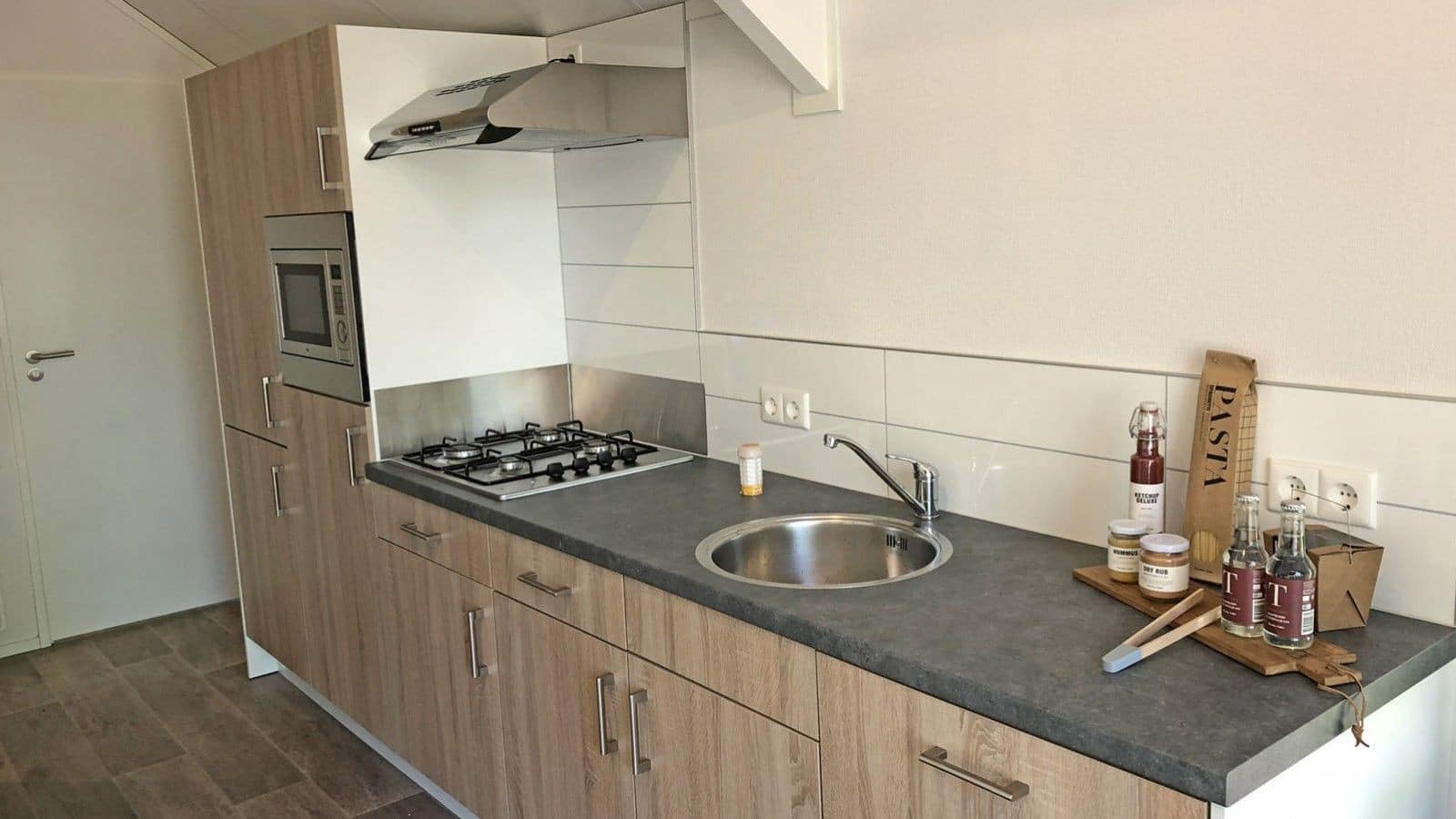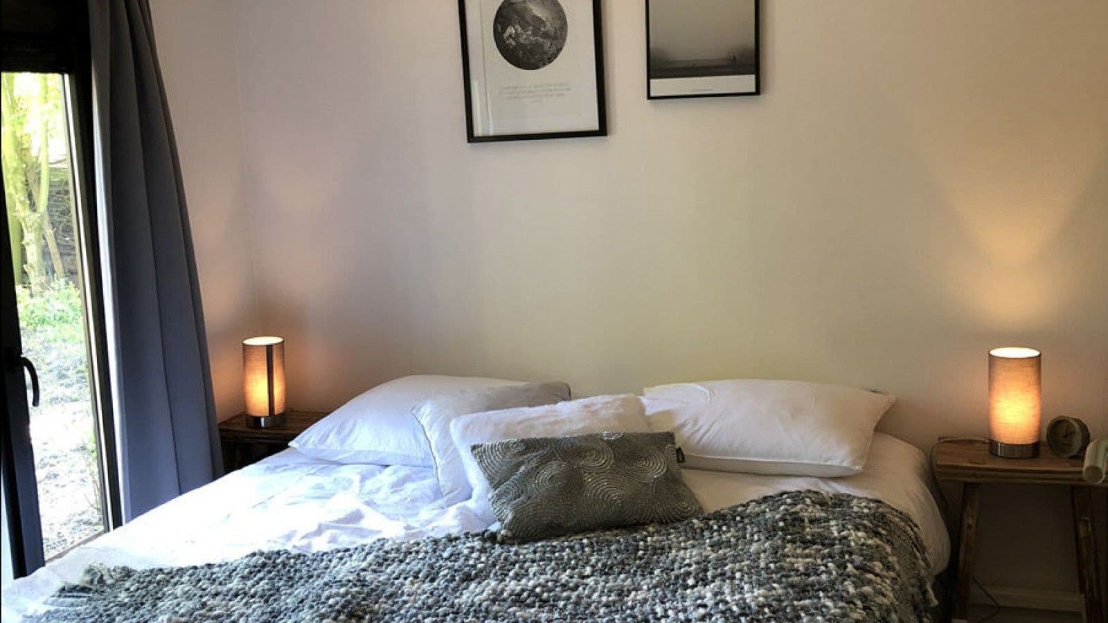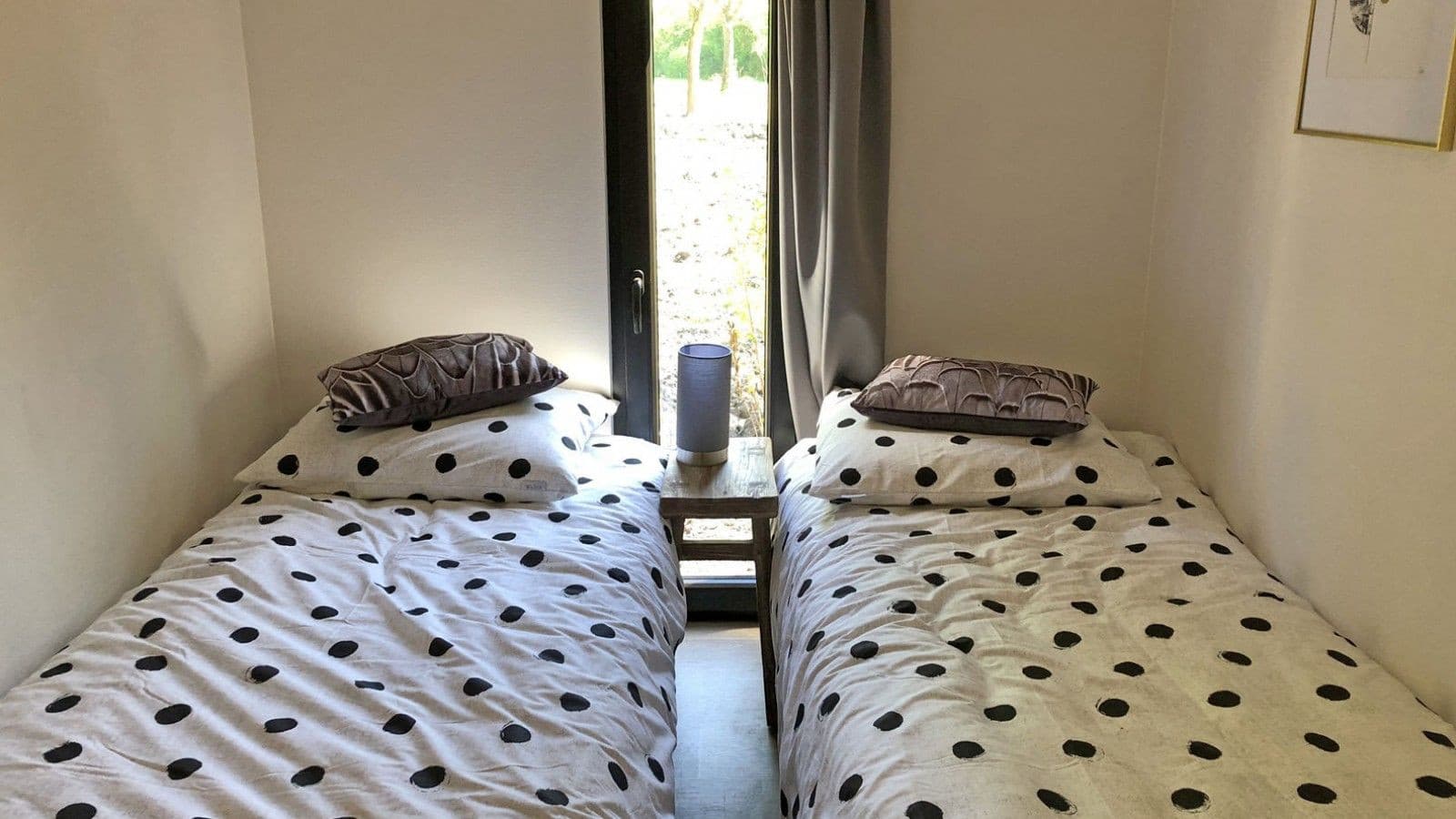 De Beach House is net iets groter dan een tiny house en biedt plaats aan 4 personen. Er zijn twee slaapkamers, een badkamer, keuken en gezellige woonkamer. De openslaande deuren leiden naar het terras, een fijn plekje waar je in alle rust geniet van het buitenleven.