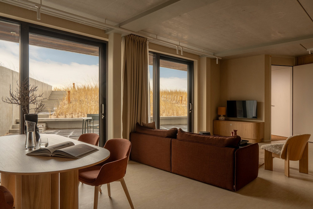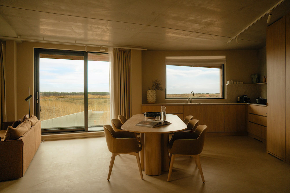 De appartementen zijn licht, modern en ingericht met natuurlijke materialen. Denk aan zandkleuren, hout, linnen. Alles klopt hier echt. Hier hoef je niet meer dan je slippers aan te trekken om je thuis te voelen.Overdag trek je er op uit. Door het duin, het bos in, of gewoon over het strand, zolang als je wilt. En als de dag langzaam uitdooft, wacht binnen een plek die voelt als een zachte omhelzing. Een glas wijn, een goed boek, niets moet. Toe aan wat extra ontspanning? In het wellnessgedeelte vind je een binnenzwembad en een fijne spa-sfeer.